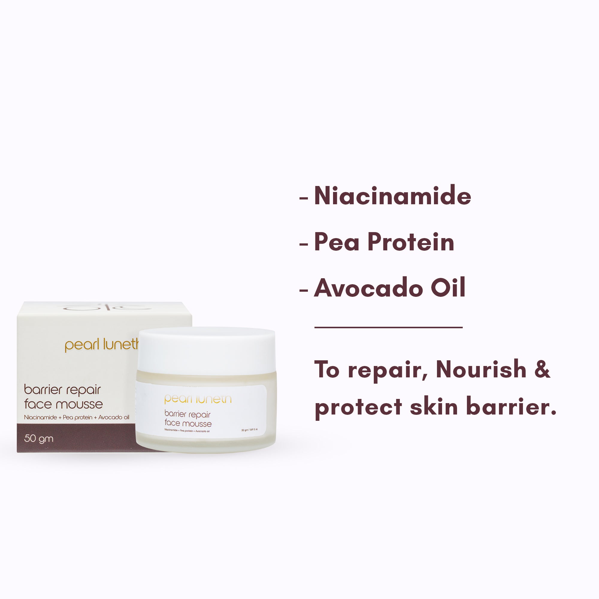 Our Face Mousse deeply hydrates, rejuvenates, and restores your skin, leaving it visibly radiant and refreshed. Infused with the goodness of Avocado oil, Pea Protein, and a potent 5% Niacinamide formulation, every smudge on your face acts as a barrier to support skin healing.